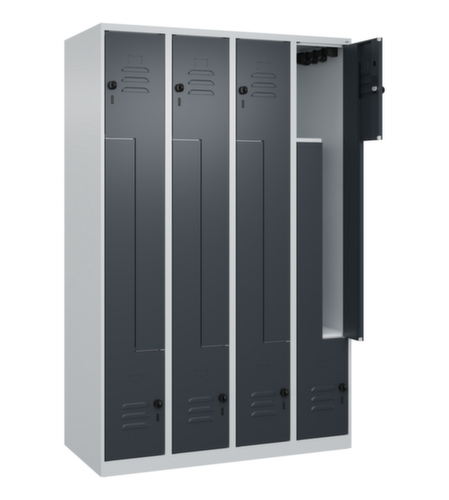 Die wichtigsten Maße des C+P Garderobenschranks Classic Plus auf einen Blick:Je Abteil eine Kleiderstange mit 3 verdrehsicheren Doppelschiebehaken. Flügeltür mit Etikettenrahmen und Lüftungsschlitzen. Die innenliegenden Drehbolzen der einschlagenden Türen bieten den Vorteil einer sauberen Optik, da keine Schrauben oder Scharniere von außen sichtbar sind. Dadurch wird das Design des Schrankes nicht beeinträchtigt und das gesamte Möbelstück wirkt hochwertiger. Damit ist auch die glatte Oberfläche leichter zu reinigen, da keine Schmutz- oder Staubablagerungen an unzugänglichen Stellen zu befürchten sind. Jede Tür ist serienmäßig mit einer Anschlagsdämpfung ausgestattet, so dass, auch durch ein schwungvolles Schließen, die Tür nicht zuknallt. Das trägt nicht nur zu einer angenehmeren Geräuschkulisse bei, sondern schont auch den Stahlschrank vor Beschädigungen. Von der Natur inspiriert schafft der BIONIC Steel Frame eine besonders effiziente und stabile Konstruktion. Durch eine raffinierte innere Struktur aus Faltungen, Streben und Zwischenräumen, sowie höhere Materialstärke an entscheidenden Stellen, wie z. B. im vorderen Bereich der Seitenwände und in den Trennwand- und Kastenprofilen, wird die Verwindungssteifigkeit zusätzlich erhöht. Verschließbar mit Sicherheits-Drehriegel für Vorhängeschloss. Das Sicherheitsschloss ist besonders aufbruchsicher, da es im verschlossenen Zustand durchdreht und erst nach Entfernung des Schlosses einrastet. Passend für alle Vorhängeschlösser mit einer Bügelstärke von 6 - 8 mm. Die zusätzlichen Lüftungsöffnungen im Abteil, kombiniert mit den Lüftungsschlitzen in der Tür, verbessern den Luftstrom. Dadurch wird der Schrankinhalt besser belüftet und trocknet schneller, ohne unangenehme Gerüche zu verursachen. Für eine besonders schlanke und raumsparende Optik steht der Schrank ohne Sockel oder Füße direkt auf dem Boden. Lediglich Bodenausgleichsschrauben sorgen für einen wackelfreien Stand bei eventuellen Bodenunebenheiten. Der Schrankboden ist für einen erhöhten Korrosionsschutz zusätzlich verzinkt. Konstruktion aus Stahl, stabil verschweißt. Das macht die Konstruktion besonders robust und widerstandsfähig und somit langlebiger. Die verschweißten Ecken und Kanten des Korpus gewährleisten eine höhere Dichtigkeit und somit eine bessere Schutzfunktion gegen Staub, Feuchtigkeit und Schmutz als eine geschraubte Konstruktion. Zudem sind keine regelmäßigen Wartungsarbeiten und Nachjustierungen nötig. Korpus mit Einbrennlackierung in RAL7035 Lichtgrau, Front mit Einbrennlackierung in RAL7016 Anthrazitgrau.