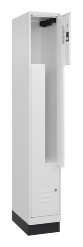 Die wichtigsten Maße des C+P Garderobenschranks Classic Plus auf einen Blick:Je Abteil eine Kleiderstange mit 3 verdrehsicheren Doppelschiebehaken. Flügeltür mit Etikettenrahmen und Lüftungsschlitzen. Die innenliegenden Drehbolzen der einschlagenden Türen bieten den Vorteil einer sauberen Optik, da keine Schrauben oder Scharniere von außen sichtbar sind. Dadurch wird das Design des Schrankes nicht beeinträchtigt und das gesamte Möbelstück wirkt hochwertiger. Damit ist auch die glatte Oberfläche leichter zu reinigen, da keine Schmutz- oder Staubablagerungen an unzugänglichen Stellen zu befürchten sind. Jede Tür ist serienmäßig mit einer Anschlagsdämpfung ausgestattet, so dass, auch durch ein schwungvolles Schließen, die Tür nicht zuknallt. Das trägt nicht nur zu einer angenehmeren Geräuschkulisse bei, sondern schont auch den Stahlschrank vor Beschädigungen. Von der Natur inspiriert schafft der BIONIC Steel Frame eine besonders effiziente und stabile Konstruktion. Durch eine raffinierte innere Struktur aus Faltungen, Streben und Zwischenräumen, sowie höhere Materialstärke an entscheidenden Stellen, wie z. B. im vorderen Bereich der Seitenwände und in den Trennwand- und Kastenprofilen, wird die Verwindungssteifigkeit zusätzlich erhöht. Verschließbar mit Zylinderschloss. Die zusätzlichen Lüftungsöffnungen im Abteil, kombiniert mit den Lüftungsschlitzen in der Tür, verbessern den Luftstrom. Dadurch wird der Schrankinhalt besser belüftet und trocknet schneller, ohne unangenehme Gerüche zu verursachen. Der untergebaute Sockel sorgt dafür, dass das Gewicht des Schrankes gleichmäßig auf dem Boden verteilt wird. Dies erhöht die Stabilität und der Schrank kann schwerer Lasten aufnehmen, als ein Schrank mit Füßen. Außerdem können Schmutz, Staub und Feuchtigkeit nicht unter den Schrank gelangen, was die Reinigungsfläche verkleinert. Konstruktion aus Stahl, stabil verschweißt. Das macht die Konstruktion besonders robust und widerstandsfähig und somit langlebiger. Die verschweißten Ecken und Kanten des Korpus gewährleisten eine höhere Dichtigkeit und somit eine bessere Schutzfunktion gegen Staub, Feuchtigkeit und Schmutz als eine geschraubte Konstruktion. Zudem sind keine regelmäßigen Wartungsarbeiten und Nachjustierungen nötig. Korpus mit Einbrennlackierung in RAL9016 Verkehrsweiß, Front mit Einbrennlackierung in RAL9016 Verkehrsweiß.