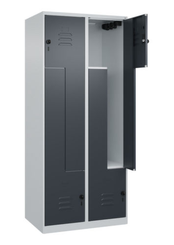 Die wichtigsten Maße des C+P Garderobenschranks Classic Plus auf einen Blick:Je Abteil eine Kleiderstange mit 3 verdrehsicheren Doppelschiebehaken. Flügeltür mit Etikettenrahmen und Lüftungsschlitzen. Die innenliegenden Drehbolzen der einschlagenden Türen bieten den Vorteil einer sauberen Optik, da keine Schrauben oder Scharniere von außen sichtbar sind. Dadurch wird das Design des Schrankes nicht beeinträchtigt und das gesamte Möbelstück wirkt hochwertiger. Damit ist auch die glatte Oberfläche leichter zu reinigen, da keine Schmutz- oder Staubablagerungen an unzugänglichen Stellen zu befürchten sind. Jede Tür ist serienmäßig mit einer Anschlagsdämpfung ausgestattet, so dass, auch durch ein schwungvolles Schließen, die Tür nicht zuknallt. Das trägt nicht nur zu einer angenehmeren Geräuschkulisse bei, sondern schont auch den Stahlschrank vor Beschädigungen. Von der Natur inspiriert schafft der BIONIC Steel Frame eine besonders effiziente und stabile Konstruktion. Durch eine raffinierte innere Struktur aus Faltungen, Streben und Zwischenräumen, sowie höhere Materialstärke an entscheidenden Stellen, wie z. B. im vorderen Bereich der Seitenwände und in den Trennwand- und Kastenprofilen, wird die Verwindungssteifigkeit zusätzlich erhöht. Verschließbar mit Sicherheits-Drehriegel für Vorhängeschloss. Das Sicherheitsschloss ist besonders aufbruchsicher, da es im verschlossenen Zustand durchdreht und erst nach Entfernung des Schlosses einrastet. Passend für alle Vorhängeschlösser mit einer Bügelstärke von 6 - 8 mm. Die zusätzlichen Lüftungsöffnungen im Abteil, kombiniert mit den Lüftungsschlitzen in der Tür, verbessern den Luftstrom. Dadurch wird der Schrankinhalt besser belüftet und trocknet schneller, ohne unangenehme Gerüche zu verursachen. Für eine besonders schlanke und raumsparende Optik steht der Schrank ohne Sockel oder Füße direkt auf dem Boden. Lediglich Bodenausgleichsschrauben sorgen für einen wackelfreien Stand bei eventuellen Bodenunebenheiten. Der Schrankboden ist für einen erhöhten Korrosionsschutz zusätzlich verzinkt. Konstruktion aus Stahl, stabil verschweißt. Das macht die Konstruktion besonders robust und widerstandsfähig und somit langlebiger. Die verschweißten Ecken und Kanten des Korpus gewährleisten eine höhere Dichtigkeit und somit eine bessere Schutzfunktion gegen Staub, Feuchtigkeit und Schmutz als eine geschraubte Konstruktion. Zudem sind keine regelmäßigen Wartungsarbeiten und Nachjustierungen nötig. Korpus mit Einbrennlackierung in RAL7035 Lichtgrau, Front mit Einbrennlackierung in RAL7016 Anthrazitgrau.