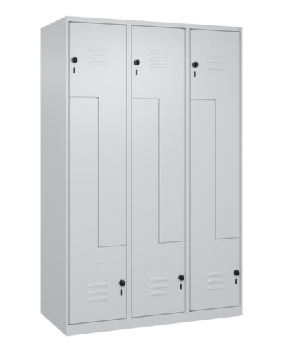 Die wichtigsten Maße des C+P Garderobenschranks Classic Plus auf einen Blick:Je Abteil eine Kleiderstange mit 3 verdrehsicheren Doppelschiebehaken. Flügeltür mit Etikettenrahmen und Lüftungsschlitzen. Die innenliegenden Drehbolzen der einschlagenden Türen bieten den Vorteil einer sauberen Optik, da keine Schrauben oder Scharniere von außen sichtbar sind. Dadurch wird das Design des Schrankes nicht beeinträchtigt und das gesamte Möbelstück wirkt hochwertiger. Damit ist auch die glatte Oberfläche leichter zu reinigen, da keine Schmutz- oder Staubablagerungen an unzugänglichen Stellen zu befürchten sind. Jede Tür ist serienmäßig mit einer Anschlagsdämpfung ausgestattet, so dass, auch durch ein schwungvolles Schließen, die Tür nicht zuknallt. Das trägt nicht nur zu einer angenehmeren Geräuschkulisse bei, sondern schont auch den Stahlschrank vor Beschädigungen. Von der Natur inspiriert schafft der BIONIC Steel Frame eine besonders effiziente und stabile Konstruktion. Durch eine raffinierte innere Struktur aus Faltungen, Streben und Zwischenräumen, sowie höhere Materialstärke an entscheidenden Stellen, wie z. B. im vorderen Bereich der Seitenwände und in den Trennwand- und Kastenprofilen, wird die Verwindungssteifigkeit zusätzlich erhöht. Verschließbar mit Sicherheits-Drehriegel für Vorhängeschloss. Das Sicherheitsschloss ist besonders aufbruchsicher, da es im verschlossenen Zustand durchdreht und erst nach Entfernung des Schlosses einrastet. Passend für alle Vorhängeschlösser mit einer Bügelstärke von 6 - 8 mm. Die zusätzlichen Lüftungsöffnungen im Abteil, kombiniert mit den Lüftungsschlitzen in der Tür, verbessern den Luftstrom. Dadurch wird der Schrankinhalt besser belüftet und trocknet schneller, ohne unangenehme Gerüche zu verursachen. Für eine besonders schlanke und raumsparende Optik steht der Schrank ohne Sockel oder Füße direkt auf dem Boden. Lediglich Bodenausgleichsschrauben sorgen für einen wackelfreien Stand bei eventuellen Bodenunebenheiten. Der Schrankboden ist für einen erhöhten Korrosionsschutz zusätzlich verzinkt. Konstruktion aus Stahl, stabil verschweißt. Das macht die Konstruktion besonders robust und widerstandsfähig und somit langlebiger. Die verschweißten Ecken und Kanten des Korpus gewährleisten eine höhere Dichtigkeit und somit eine bessere Schutzfunktion gegen Staub, Feuchtigkeit und Schmutz als eine geschraubte Konstruktion. Zudem sind keine regelmäßigen Wartungsarbeiten und Nachjustierungen nötig. Korpus mit Einbrennlackierung in RAL7035 Lichtgrau, Front mit Einbrennlackierung in RAL7035 Lichtgrau.