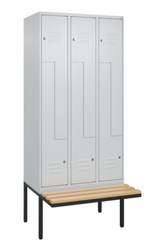 Die wichtigsten Maße des C+P Garderobenschranks Classic Plus auf einen Blick:Je Abteil eine Kleiderstange mit 3 verdrehsicheren Doppelschiebehaken. Z-Flügeltür mit Etikettenrahmen und Lüftungsschlitzen. Die innenliegenden Drehbolzen der einschlagenden Türen bieten den Vorteil einer sauberen Optik, da keine Schrauben oder Scharniere von außen sichtbar sind. Dadurch wird das Design des Schrankes nicht beeinträchtigt und das gesamte Möbelstück wirkt hochwertiger. Damit ist auch die glatte Oberfläche leichter zu reinigen, da keine Schmutz- oder Staubablagerungen an unzugänglichen Stellen zu befürchten sind. Jede Tür ist serienmäßig mit einer Anschlagsdämpfung ausgestattet, so dass, auch durch ein schwungvolles Schließen, die Tür nicht zuknallt. Das trägt nicht nur zu einer angenehmeren Geräuschkulisse bei, sondern schont auch den Stahlschrank vor Beschädigungen. Von der Natur inspiriert schafft der BIONIC Steel Frame eine besonders effiziente und stabile Konstruktion. Durch eine raffinierte innere Struktur aus Faltungen, Streben und Zwischenräumen, sowie höhere Materialstärke an entscheidenden Stellen, wie z. B. im vorderen Bereich der Seitenwände und in den Trennwand- und Kastenprofilen, wird die Verwindungssteifigkeit zusätzlich erhöht. Verschließbar mit Zylinderschloss. Die zusätzlichen Lüftungsöffnungen im Abteil, kombiniert mit den Lüftungsschlitzen in der Tür, verbessern den Luftstrom. Dadurch wird der Schrankinhalt besser belüftet und trocknet schneller, ohne unangenehme Gerüche zu verursachen. Die schwebende Sitzbank bietet mehr Freiraum für ein bequemes An- und Ausziehen, ohne dass die Füße des Gestells im Weg sind. Die Leisten sind aus Buchenholz. Konstruktion aus Stahl, stabil verschweißt. Das macht die Konstruktion besonders robust und widerstandsfähig und somit langlebiger. Die verschweißten Ecken und Kanten des Korpus gewährleisten eine höhere Dichtigkeit und somit eine bessere Schutzfunktion gegen Staub, Feuchtigkeit und Schmutz als eine geschraubte Konstruktion. Zudem sind keine regelmäßigen Wartungsarbeiten und Nachjustierungen nötig. Korpus mit Einbrennlackierung in RAL7035 Lichtgrau, Front mit Einbrennlackierung in RAL7035 Lichtgrau.