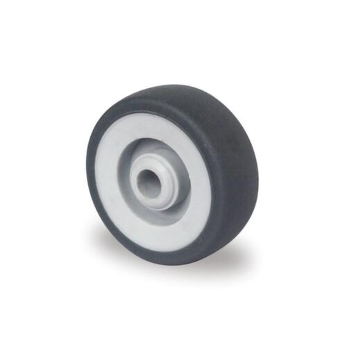 Mit bodenschonender TPE-Bereifung. Durchmesser 75 mm. Nabe mit stoßunempfindlichem und korrosionsbeständigem Gleitlager. Felge aus bruchsicherem Polypropylen. Felge ohne Fadenschutz.