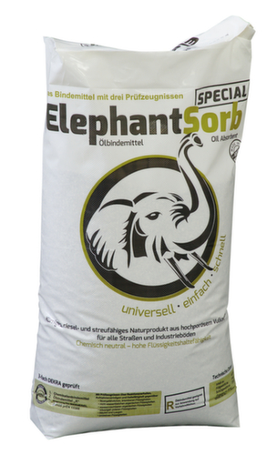 "longDescription": "<h2>Chemikalien- und Ölbindemittel Elephant Sorb</h2><strong>3-fach DEKRA geprüft</strong><br><ul><li><strong>Gewährleistet eine ausreichende Wiederherstellung der Griffigkeit der Fahrbahn</strong> - Zusatz „R“ für die Eignung zur Anwendung auf Verkehrsflächen </li><li><strong>Universell einsetzbar</strong> - Absortption von Ölen, wässrigen Flüssigkeiten, Säuren, Laugen, oxidativen und brennbaren flüssigen Chemikalien</li><li><strong>Hohe Haltefähigkeit und chemisch neutral</strong> - aus hochprösem Vulkangestein</li><li><strong>Sparsamer und zielgenauer Einsatz</strong> - PE-Sack mit wieder verschließbarem Dosierrüssel</li><li><strong>Nicht kennzeichnungspflichtig</strong> - nicht brennbar, nicht selbstentzündlich und nicht explosionsgefährlich</li></ul><br><strong>Sie haben die Wahl:</strong><br><ul><li><strong>Ideal für Vertiefungen und kleine Risse oder im Freien</strong> - Elephant Sorb Special feinkörnig oder Elephant Sorb grobkörnig</li></ul>",
