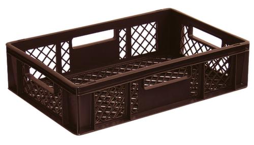 Maßlich auf die Europalette abgestimmt. Aus bruchsicherem Polypropylen in braun. Wände durchbrochen, Boden durchbrochen. Boden mit Verstärkung durch Verstärkungsrippen. Einfacher Transport durch Muschelgriffe. Mehrfach stapelbar. Lebensmittelgeeignet. Für Rollenbahnen geeignet. Temperaturbeständig -20 °C bis +80 °C. Geeignet für verschiedene Stoffe, bitte anfragen.