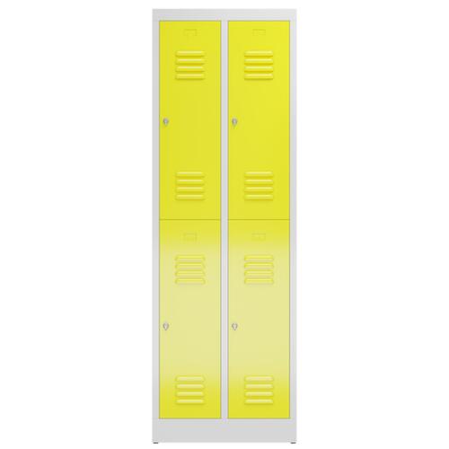 Je Abteil 1 Kleiderstange und 2 Doppelhaken pro Fach. Flügeltür mit Lüftungsschlitzen. Verschließbar mit Drehriegelverschluss für Vorhängeschloss. Jedes Abteil einzeln verschließbar. Der untergebaute Sockel sorgt dafür, dass das Gewicht des Schrankes gleichmäßig auf dem Boden verteilt wird. Dies erhöht die Stabilität und der Schrank kann schwerer Lasten aufnehmen, als ein Schrank mit Füßen. Außerdem können Schmutz, Staub und Feuchtigkeit nicht unter den Schrank gelangen, was die Reinigungsfläche verkleinert. Konstruktion aus Stahl, verschweißt. Korpus mit elektrostatischer Pulverbeschichtung in RAL7035 Lichtgrau, Front mit elektrostatischer Pulverbeschichtung in RAL1018 Zinkgelb.