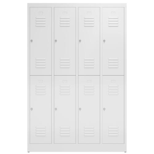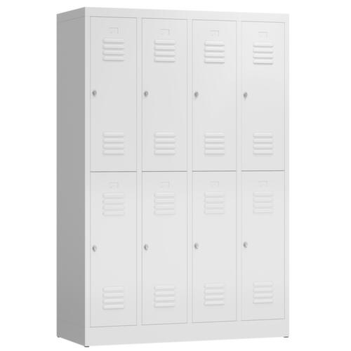 Je Abteil 1 Kleiderstange und 2 Doppelhaken pro Fach. Flügeltür mit Lüftungsschlitzen. Verschließbar mit Drehriegelverschluss für Vorhängeschloss. Jedes Abteil einzeln verschließbar. Der untergebaute Sockel sorgt dafür, dass das Gewicht des Schrankes gleichmäßig auf dem Boden verteilt wird. Dies erhöht die Stabilität und der Schrank kann schwerer Lasten aufnehmen, als ein Schrank mit Füßen. Außerdem können Schmutz, Staub und Feuchtigkeit nicht unter den Schrank gelangen, was die Reinigungsfläche verkleinert. Konstruktion aus Stahl, verschweißt. Korpus mit elektrostatischer Pulverbeschichtung in RAL9003 Signalweiß, Front mit elektrostatischer Pulverbeschichtung in RAL9003 Signalweiß.
