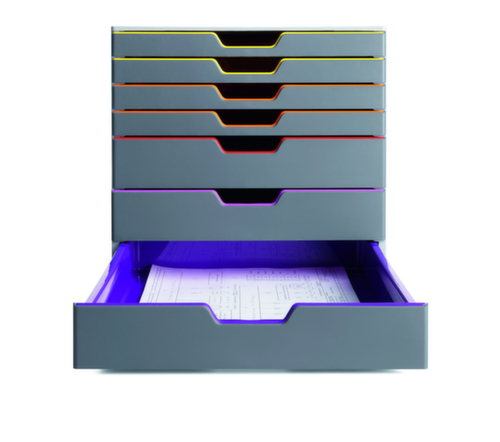 "longDescription": "<h2>Schubladenbox</h2><strong>klassisches Design mit modernem Touch</strong><br><ul><li><strong>Perfekt organisiert und alles griffbereit</strong> - mit feinen Farblinien bei geschlossenen Schubladen</li><li><strong>Individuell beschriftbar</strong> - inklusive Beschriftungsfenstern und auswechselbaren Einsteck-Etiketten</li><li><strong>Leicht und leise</strong> - geräuschfreie Schubladen mit Auszugssperre</li><li><strong>Stabil</strong> - aus Kunststoff</li><li><strong>Standfest</strong> - mit rutschfesten Füßen</li></ul><br>Ordnung schaffen mit System und Design! <br>Die Schubladenbox VARICOLOR® von Durable hilft nicht nur dabei noch mehr Ordnung zu schaffen, sie sieht dabei auch noch toll aus! Feine Farblinien an den Schubladen setzen sich von dem schlichten grauen Korpus ab. Damit überzeugt die Schubladenbox nicht nur optisch, sondern auch funktional! Denn die farbigen Linien helfen bei der besseren Orientierung und Organisation auf Ihrem Schreibtisch.<br><br>Die Schubladenbox besteht aus Kunststoff. Der Korpus ist einem hellen grau, die Schubladenfronten sind dunkelgrau. Von innen sind die Schubladen bunt. Die Farbe ist von außen bei geschlossenen Schubladen als dünne Linie zu erkennen. Jede Schublade ist in einer anderen Farbe, die durch die entsprechende Anordnung einen schönen Farbverlauf ergeben. So muss sich die Box nicht verstecken und kann auch gut sichtbar auf Ihren Schreibtisch stehen.<br><br>Die Schubladen sind für Formate bis DIN A4, C4 sowie Folio- und Letter-Size-Formate geeignet. Also passend für die gängigsten Papierformate im Büro.<br>Ordnung am Arbeitsplatz braucht auch Struktur! Für eine optimale Orientierung nutzen Sie doch einfach die beiliegenden Beschriftungsfenster. Diese sind mit leicht auswechselbaren Einsteck-Etiketten individuell zu beschriften. Auch eine Beschriftung mit dem Computer ist möglich. Damit wissen Sie und Andere genau, wo was zu finden ist.<br><br>Die Schubladen verfügen über einen geräuschfreien Leichtlauf. Kein Ruckeln an den Schubladen, keine störenden Geräusche mehr. Zudem ist die Schubladenbox mit einer Auszugssperre ausgestattet. So wird verhindert, dass die Schublade ausversehen komplett rausgezogen wird. Fast jeder kennt das Problem und das danach folgende Geduldsspiel, um die Schublade samt Inhalt wieder in die richtige Spur zu bekommen. Die Auszugssperre wird dies verhindern!<br><br>Auf der Unterseite der Schubladenbox befinden sich rutschfeste Füße aus Kunststoff. Dadurch steht sie sicher an ihrem Platz. Die Box ist deswegen auch stapelbar oder aber für Reihenaufstellung auf allen Sideboards und Büroschränken mit Standardmaße geeignet. Durch das elegante Design passt Schubladenbox nahezu in jedes Umfeld.<br><br>Sie können sich zwischen einer Box mit 5, 7 oder 10 Schubladen entscheiden. Oder Sie nehmen gleich mehrere mit unterschiedlicher Anzahl an Schubladen und stellen diese neben- oder aufeinander. Das ist deshalb so gut möglich, da die Schubladenboxen trotz unterschiedlicher Anzahl an Schubladen die gleichen Außenmaße haben.<br>",