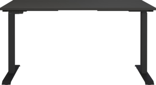 Platte aus Spanplatte mit pflegeleichter Melaminharzbeschichtung in Dekor graphit. Kante mit schlagfestem ABS-Umleimer, der vor unschönen Rissen und Ausbrechen schützt. T-Fußgestell aus Metall mit schlag- und kratzfester Pulverbeschichtung in schwarz. Höhenverstellung durch Elektromotor. Funktionen: Abspeichern und automatisches Abrufen von programmierten Tischhöhen dank Memoryfunktion. Gestell mit nivellierbaren Kunststoffgleitern, mit denen sich Bodenunebenheiten optimal ausbessern lassen. Mit Stromkabel, Stecker und Bedieneinheit elektrifizierbar.