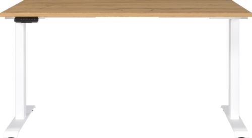 Platte aus Spanplatte mit pflegeleichter Melaminharzbeschichtung in Dekor Grandson-Eiche. Plattenform eckig. Kante Alle Kanten sind durch schlagfeste ABS-Umleimer vor unschönen Rissen und Ausbrechen geschützt. C-Fußgestell aus Metall mit schlag- und kratzfester Pulverbeschichtung in weiß. Höhenverstellung durch 2 Elektromotoren unterstützen Sie bei einer komfortablen Höhenverstellung auf Knopfdruck. Der automatische Kollisionsschutz stoppt sofort bei Widerstand von oben oder unten und sorgt somit für absolute Sicherheit. Gestell mit Kunststoffgleiter.