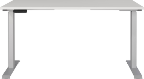 Platte aus Spanplatte mit pflegeleichter Melaminharzbeschichtung in Dekor lichtgrau. Plattenform eckig. Kante Alle Kanten sind durch schlagfeste ABS-Umleimer vor unschönen Rissen und Ausbrechen geschützt. C-Fußgestell aus Metall mit schlag- und kratzfester Pulverbeschichtung in silber. Höhenverstellung durch 2 Elektromotoren unterstützen Sie bei einer komfortablen Höhenverstellung auf Knopfdruck. Der automatische Kollisionsschutz stoppt sofort bei Widerstand von oben oder unten und sorgt somit für absolute Sicherheit. Gestell mit Kunststoffgleiter.