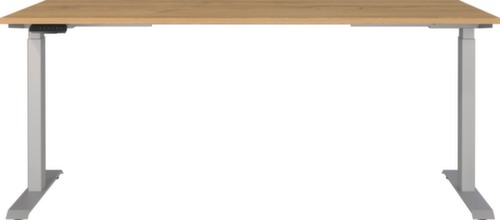 Platte aus Spanplatte mit pflegeleichter Melaminharzbeschichtung in Dekor Grandson-Eiche. Kante mit schlagfestem ABS-Umleimer, der vor unschönen Rissen und Ausbrechen schützt. Doppel-T-Fußgestell aus Metall mit schlag- und kratzfester Pulverbeschichtung in silber. Gestell mit nivellierbaren Kunststoffgleitern, mit denen sich Bodenunebenheiten optimal ausbessern lassen. Mit Stromkabel, Stecker und Bedieneinheit elektrifizierbar.