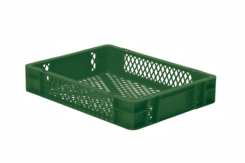 Maßlich auf die Europalette abgestimmt. Aus bruchsicherem Polypropylen in grün. Wände durchbrochen, Boden durchbrochen. Mehrfach stapelbar. Lebensmittelgeeignet. Für Rollenbahnen geeignet. Temperaturbeständig -20 °C bis +80 °C.