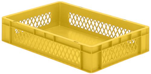 Maßlich auf die Europalette abgestimmt. Aus bruchsicherem Polypropylen in gelb. Wände durchbrochen, Boden geschlossen. Mehrfach stapelbar. Lebensmittelgeeignet. Für Rollenbahnen geeignet. Temperaturbeständig -20 °C bis +80 °C. Geeignet für verschiedene Stoffe, bitte anfragen.