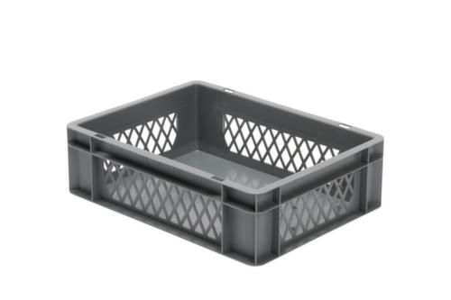 Maßlich auf die Europalette abgestimmt. Aus bruchsicherem Polypropylen in grau. Wände durchbrochen, Boden geschlossen. Mehrfach stapelbar. Lebensmittelgeeignet. Für Rollenbahnen geeignet. Temperaturbeständig -20 °C bis +80 °C. Geeignet für verschiedene Stoffe, bitte anfragen.