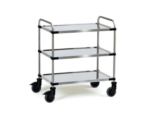 Etage(n) aus Edelstahl mit Abrollrand. Edelstahlkonstruktion. Leicht zu manövrieren und verfahren durch 4 Lenkrollen, Feststeller an zwei Lenkrollen gewähren bei Bedarf stets einen sicheren Stand. Rad Ø 125 mm. Räder mit bodenschonender TPE-Bereifung. Naben mit für den Dauerbetrieb geeignetem Kugellager. Radanordnung rechteckig.