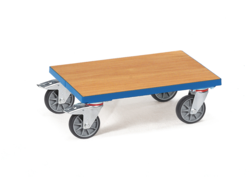 Ideal für Euronormbehälter geeignet. Plattform aus Holz Der Rahmen schließt bündig mit der Plattform ab, RAL5007 Brillantblau. Gestell mit schlag- und kratzfester Pulverbeschichtung in RAL5007 Brillantblau. Stahlkonstruktion, verschweißt. Leicht zu manövrieren und verfahren durch 4 Lenkrollen. Die Feststeller an 2 Lenkrollen gewähren einen sicheren Stand. Rad Ø 125 mm. Mit bodenschonender TPE-Bereifung. Naben mit leichtgängigem und wartungsarmem Rillenkugellager.