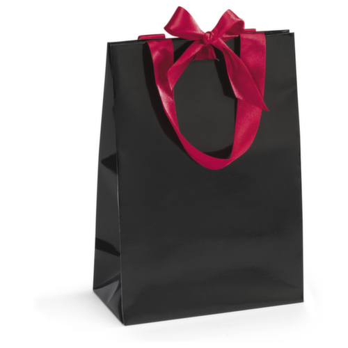 En plus de l'aspect raffiné du papier laqué, ce sac a des poignées et des nœuds de fermeture en satin. Le papier laqué brillant et les nœuds en satin donnent à ce cabas un look élégant, ce qui le rend particulièrement adapté aux moments festifs. - Poignées et nœuds de fermeture en satin- Renfort en carton sur le bord supérieur- Fond en carton pour une grande stabilité- Avec soufflets latéraux pour faciliter le remplissage- Fabriqué en papier laqué 170 g/m²- Unité d'emballage (UE) : 25 pièces