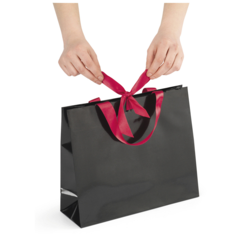 En plus de l'aspect raffiné du papier laqué, ce sac a des poignées et des nœuds de fermeture en satin. Le papier laqué brillant et les nœuds en satin donnent à ce cabas un look élégant, ce qui le rend particulièrement adapté aux moments festifs. - Poignées et nœuds de fermeture en satin- Renfort en carton sur le bord supérieur- Fond en carton pour une grande stabilité- Avec soufflets latéraux pour faciliter le remplissage- Fabriqué en papier laqué 170 g/m²- Unité d'emballage (UE) : 25 pièces