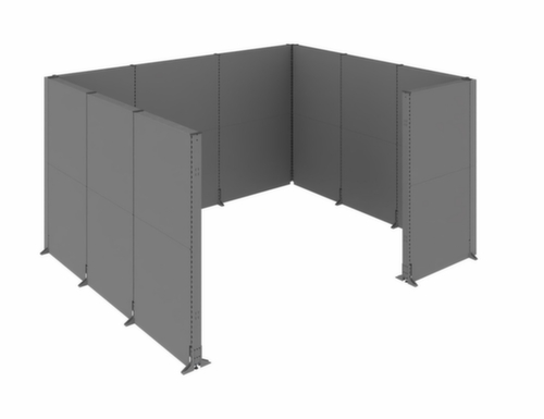les principales dimensions du du kit pour cloison démontable en un coup d’œil :installation : Pour montage au sol (les ancrages au sol doivent être assurés côté client). kit comprenant : 10 parois. 2 côtés mesurent 3 m de long, 1 côté fait 3,5 m de long et 1 élément d'angle fait 1 m de long. paroi en tôle d'acier en RAL7037 gris poussière avec calage en non-tissé polyester (matériau d'isolation optimal). structure en acier avec finition époxy résistante aux chocs et aux rayures RAL7037 gris poussière.