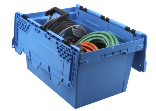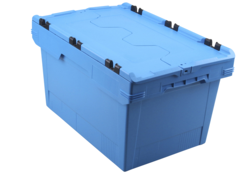 dimensions adaptées aux palettes européennes. en polypropylène incassable en bleu. Parois plein, fond plein. couvercle crocodile. Avec couvercle fermé gerbable. Gerbages avec couvercle ouvert. convient pour aliments. Résistant à la température -10 °C à +60 °C.
