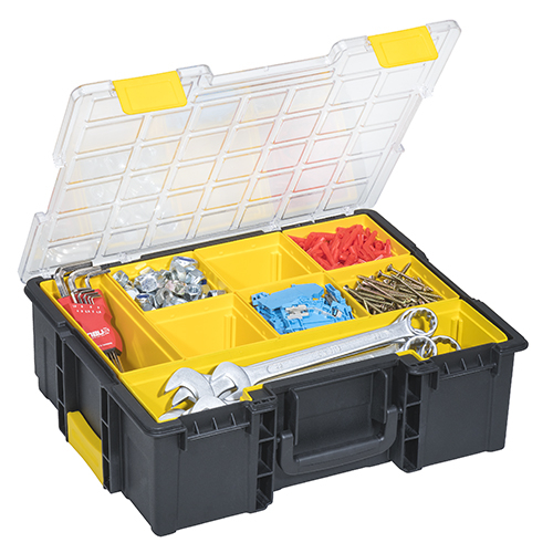 équipé de bacs amovibles. bacs amovible. avec Poignée de transport. mallette en polypropylène incassable. mallette en noir. bacs en jaune. Verrouillable avec couvercle, avec clips de fermeture. couvercle en polycarbonate.
