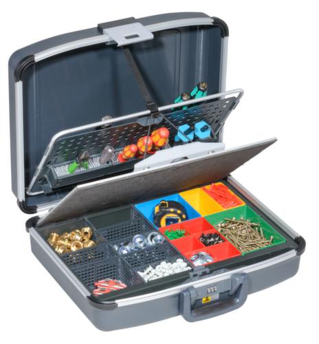 "longDescription": "<h2>Mallette de transport et d’atelier</h2><strong>prêtes à l’emploi grâce à l’équipement pratique</strong><br><ul><li><strong>Ouverture et fermeture faciles</strong> - commande d'une main</li></ul>L'affaire<br>Cette mallette de service de la série ProServe d'Allit est fabriquée en polycarbonate et est donc extrêmement robuste et résistante aux chocs. Le cadre du profilé est en aluminium et se ferme hermétiquement. L'étui est facile à ouvrir et à fermer d'une seule main : Il suffit d'appuyer sur le boîtier pour le fermer et d'actionner le levier à une main pour l'ouvrir. Le couvercle se verrouille en position lorsqu'il est ouvert. En outre, il dispose d'un frein de couvercle intégré, qui offre une résistance et contrôle ainsi le poids du couvercle lors de la fermeture. L'étui peut être verrouillé par une serrure à combinaison et protège vos ustensiles contre tout accès non autorisé.<br><br>L'équipement intérieur<br>La mallette de montage est disponible au choix comme modèle de base ou avec divers aménagements intérieurs. Vous pouvez équiper le modèle de base de nombreux éléments de cloison en fonction de vos besoins individuels. Vous pouvez notamment choisir entre des porte-outils, des boîtes à petites pièces ou des inserts en mousse.<br><br>Le matériau<br>Le polycarbonate présente une résistance, une rigidité et une dureté élevées et possède de bonnes propriétés d'isolation contre l'électricité. En outre, le matériau a une large gamme de températures et résiste à l'eau, à de nombreuses huiles et graisses, à de nombreux acides minéraux et à des solutions aqueuses de sels neutres et d'agents oxydants. Le polycarbonate a donc une très grande résistance au vieillissement et fait de cette mallette de montage votre compagnon de longue date.<br><ul><li><strong>Résiste à la haute pression</strong> - en polycarbonate</li><li><strong>Frein de couvercle intégré</strong> - le couvercle s'engage à l'ouverture et freine à la fermeture.- Pas de clés nécessaires - avec serrure à combinaison</li></ul><br><strong>Bon à savoir !</strong><br>Vous planifiez un voyage en avion avec votre mallette de transport ? Commandez en même temps la sangle de valise avec serrure à combinaison TSA.<br>",