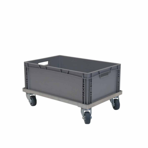 Idéal pour le bac norme Europe. plateforme ouvert. plateforme en profilé cornière en aluminium avec rebord antichute. structure en aluminium. Manœuvre et déplacement aisés grâce à 4 roulettes pivotantes. Ø de roue 80 mm. Avec bandage TPE préservant le sol sur jante polypropylène robuste et incassable.
