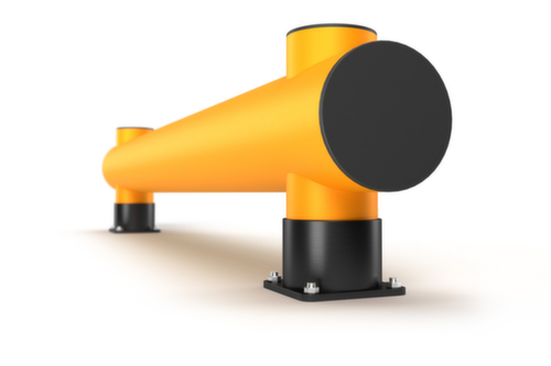 principales dimensions du a.m.p.e.r.e. système de protection anticollision Rack Mammut® en un coup d'œil :Grâce au plastique spécial, la barrière absorbe les énergies d’impact et reprend sa forme initiale. en polyoléfine performante et durable, coloris jaune/noir. fixation à la plaque de fond par ancrages au sol.