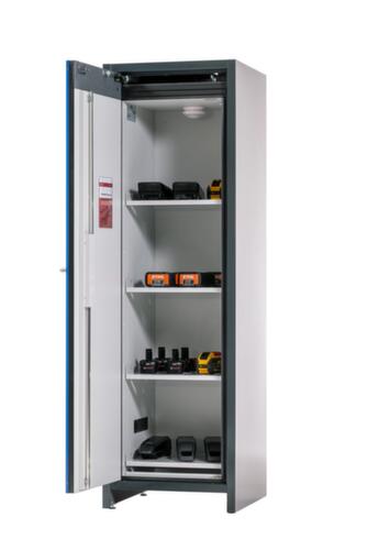 Les principales dimensions en un coup d'œil :L'aération est régulée par entrée et évacuation de l'air dans le dessus de l'armoire. Grâce à la porte battante, vous disposez à la fois d’un stockage à l’abri de la poussière et d’une bonne vue d’ensemble, butée de porte à gauche. à verrouillage sécurisé avec serrure à cylindre profilé avec affichage de l’état de fermeture (rouge/vert), Le verrouillage de sécurité à 2 points offre une grande stabilité et une protection anti-effraction efficace. butée de porte à gauche. Le système d'alerte incendie intégré et les portes à fermeture automatique garantissent un équipement de sécurité optimal de l'armoire de stockage de batteries. 4 plateau(x) avec tablette en acier ajourée, en bas 1 plateau avec tablette de rétention. volume de rétention du bac de rétention 1 l. équipé de tablettes, tablette de rétention. soubassement Les pieds de réglage intégrés compensent les irrégularités du sol et favorisent une position bien droite.