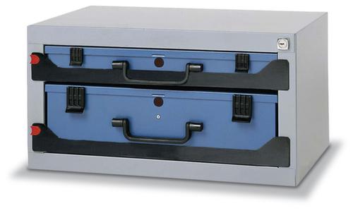 en acier, corps avec finition époxy résistante aux chocs et aux rayures en RAL7000 gris petit-gris. Grâce aux glissières télescopiques à billes, les bacs s’ouvrent et se ferment très facilement, même en cas de charge élevée. L’extension totale permet un accès facile à 100% dans tous les coins. Le blocage d'extension individuel empêche l'ouverture simultanée de plusieurs tiroirs et, par là même, un basculement. Verrouillable par serrure de sécurité. 2 mallette. mallette en acier. mallette avec finition époxy résistante aux chocs et aux rayures en RAL5007 bleu brillant. bacs en de couleur.