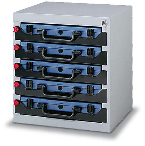 en acier, corps avec finition époxy résistante aux chocs et aux rayures en RAL7000 gris petit-gris. Grâce aux glissières télescopiques à billes, les bacs s’ouvrent et se ferment très facilement, même en cas de charge élevée. L’extension totale permet un accès facile à 100% dans tous les coins. Le blocage d'extension individuel empêche l'ouverture simultanée de plusieurs tiroirs et, par là même, un basculement. Verrouillable par serrure de sécurité. 5 mallette. mallette en acier. mallette avec finition époxy résistante aux chocs et aux rayures en RAL5007 bleu brillant. bacs en de couleur.