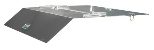 "longDescription": "<h2>Couvercle à charnière</h2><strong>pour conteneur basculant</strong><br><ul><li>Couvercle en deux parties - peut être ouvert des deux côtés</li><li>Utilisation sûre - peut être verrouillé lorsqu'il est ouvert</li><li>Protection contre la corrosion - en acier galvanisé</li></ul>",