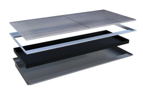 Rétrofitez les rayonnages à palettes ou d'autres rayonnages modulaires avec le bac de rétention à suspension en vue du stockage de produits dangereux, rapidement et conformément à la loi. Contrairement à d'autres bacs de rétention, le bac à suspension n'est pas posé sous le rayonnage, mais directement sur les traverses longitudinales comme niveau à part entière. La saillie sur les côtés longs forme une surface d'appui fiable. Le bac de rétention s'engage ainsi entre les traverses longitudinales et ne glisse pas.