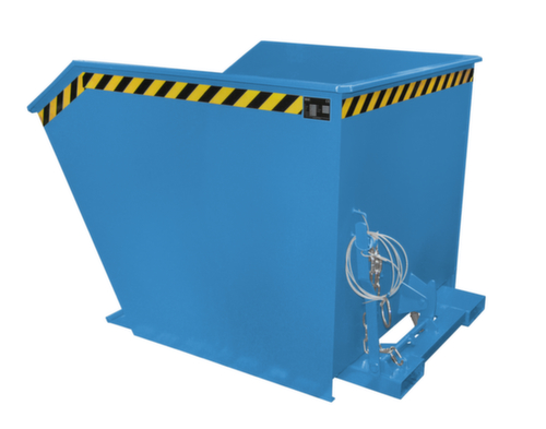 Les principales dimensions de la Bauer benne basculante en un coup d'œilLe procédé de basculement est déclenché confortablement depuis le siège conducteur par déverrouillage du câble de traction. La disposition particulière du pivot assure un angle de basculement avantageux et donc un vidage rapide et complet. Le retour à la position d’origine s’effectue par abaissement au sol et la protection antibasculement se réenclenche automatiquement. Avec une chaîne de sécurité sur les fourreaux de fourche, la benne basculante peut également être fixée au gerbeur afin d’éviter qu’elle ne glisse . Grande stabilité grâce à des bords renforcés sur tout le pourtour et à un châssis stable. Structure robuste en acier avec laquage coloris RAL 5012 bleu clair. Pour transporter et vider la benne basculante facilement, il suffit de la saisir avec le gerbeur via les fourreaux de fourche, puis de la placer à la position et à la hauteur souhaitées.