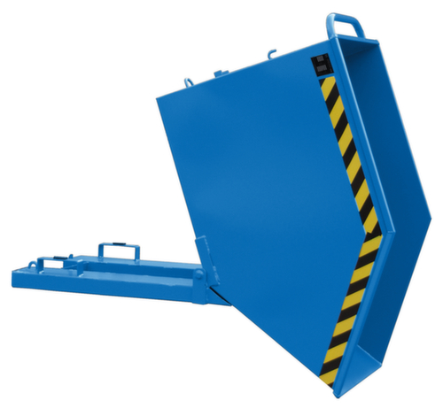 Les principales dimensions de la Bauer benne basculante en un coup d'œilLe procédé de basculement est facile à déclencher manuellement à l'aide d'une poignée située au dos. Pour protéger contre le basculement accidentel, la sécurité anti-basculement à ressort s'enclenche automatiquement lors du retour du conteneur. La benne basculante convient également pour la charge de liquides puisqu’elle est soudée de manière étanche à l’huile et à l’eau. Stabilité élevée grâce aux bords renforcés sur tout le pourtour. Structure robuste en acier avec laquage coloris RAL 5012 bleu clair. Pour transporter et vider la benne basculante facilement, il suffit de la saisir avec le gerbeur via les fourreaux de fourche, puis de la placer à la position et à la hauteur souhaitées.