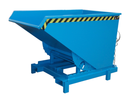 Lorsque la benne basculante est déposée sur le bord du conteneur, le pied de déclenchement déclenche le déverrouillage et un vidage automatique. Votre processus de travail est ainsi confortablement accéléré tout en augmentant la sécurité dans votre entreprise. Il est également possible à tout moment de vider le récipient manuellement grâce à un déverrouillage du câble de traction. Les patins de protection garantissent un basculement en douceur grâce au centre de gravité avantageux de la charge. Après le vidage, la benne basculante retourne automatiquement à sa position initiale et la protection antibasculement se réenclenche automatiquement. Structure robuste en acier avec laquage coloris RAL 5012 bleu clair. Pour transporter et vider la benne basculante facilement, il suffit de la saisir avec le gerbeur via les fourreaux de fourche, puis de la placer à la position et à la hauteur souhaitées.
