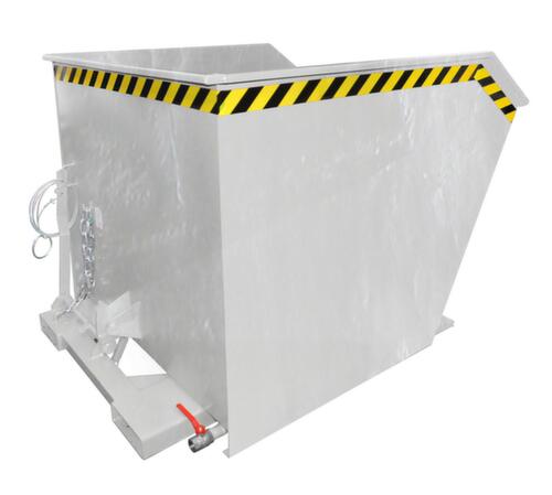 Le procédé de basculement est déclenché confortablement depuis le siège conducteur par déverrouillage du câble de traction. La disposition particulière du pivot assure un angle de basculement avantageux et donc un vidage rapide et complet. La protection antibasculement garantit que la benne ne se renverse pas accidentellement pendant le transport. La benne basculante convient également pour la charge de liquides puisqu’elle est soudée de manière étanche à l’huile et à l’eau. Les liquides collectés, comme l’huile ou l’eau, sont séparés des matières solides par un tamis et peuvent être vidés rapidement via un robinet de vidange, sans devoir basculer le conteneur. parois plein. Grande stabilité grâce à des bords renforcés sur tout le pourtour et à un châssis stable. Utilisation mobile. Avec fourreaux pour fourche pour un transport facile.