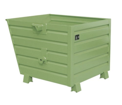 Le procédé de basculement est déclenché confortablement depuis le siège conducteur par déverrouillage du câble de traction. Une traverse pour gerbeur supplémentaire est nécessaire pour le basculement (non comprise dans la livraison). Le bac est accroché via deux pivots, soulevé par le gerbeur et peut ensuite être vidé au-dessus d’un conteneur. Par les pieds de gerbage robustes la benne basculante gerbable gerbable 3 fois, même à l’état rempli peut être empilée en toute sécurité, ce qui permet de gagner de la place lors du stockage. Les parois latérales profilées et le bord renforcé rendent le conteneur rigide et garantissent une capacité de charge élevée. Structure robuste en acier avec laquage coloris RAL6011 vert réséda. pieds.