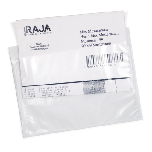Les principales dimensions de la pochette pour documents d'accompagnement Eco en un coup d'œil :En film PE épaisseur 60 µm. en transparent. face arrière autocollante.