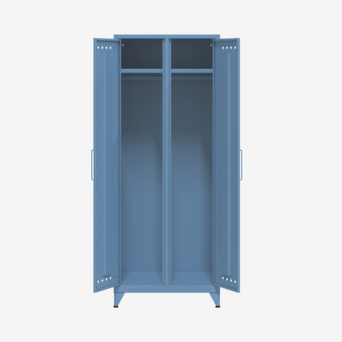Les principales dimensions de la Bisley armoire à linge Fern Maxi en un coup d’œil :par compartiment Tablette à chapeaux et tringle. Avec cloison de séparation médiane. Fermeture avec protection contre la poussière via une porte à double battant. fermeture affleurante de la porte au corps. Avec poignées. Les orifices de ventilation design intégrés dans la porte assurent une circulation de l'air en continu. 4 pieds garantissent un support stable. structure en acier, soudé. corps avec laquage en bleu, face avant avec laquage en bleu.