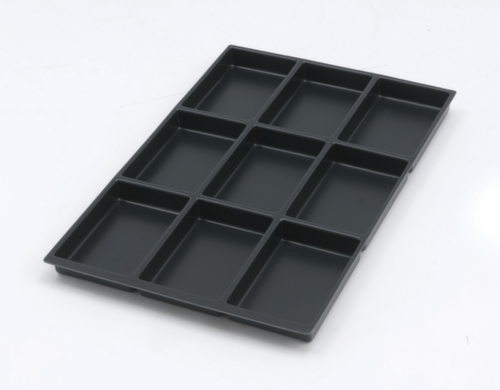 "metaDescription": "Bisley Jeu d'inserts pour tiroirs - 9compartiments, p. face avant H 22mm, lxP 232x365mm, plastique, noir",