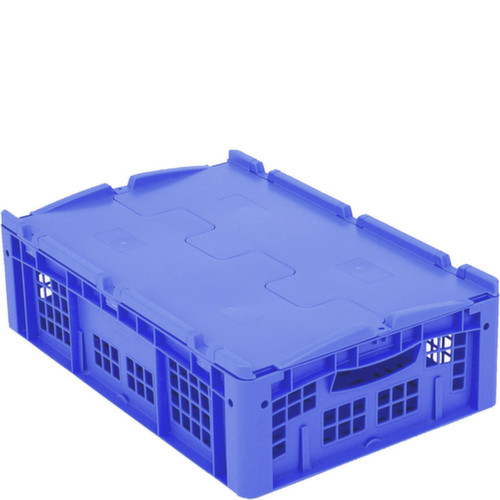 dimensions adaptées aux palettes européennes. en polypropylène incassable en bleu. Parois ajourés, fond ajourés. Fond avec renfort grâce à des nervures de renfort doubles. La marchandise stockée est protégée contre la poussière et la saleté grâce au couvercle à charnière en 2 parties. transport facile grâce à poignées ouvertes. Plusieurs niveaux gerbable. convient pour aliments.