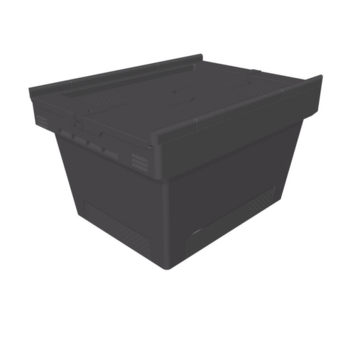 en polypropylène régénéré. La marchandise se stocke à l’abri de la poussière grâce aux parois fermées et le récipient se nettoie facilement. fond plein. couvercle rabattable en deux parties en noir. couvercle en nouveau granulé. Plusieurs niveaux gerbable. Gerbages avec couvercle ouvert.