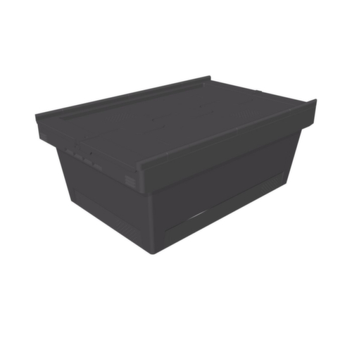 en polypropylène régénéré. La marchandise se stocke à l’abri de la poussière grâce aux parois fermées et le récipient se nettoie facilement. fond plein. couvercle rabattable en deux parties en noir. couvercle en nouveau granulé. Plusieurs niveaux gerbable. Gerbages avec couvercle ouvert.