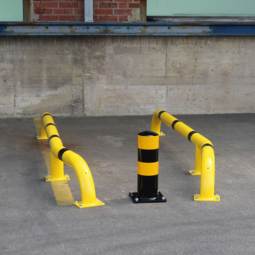principales dimensions du BLACK BULL système de protection anticollision en un coup d'œil :structure Les bandes réfléchissantes colorées assurent une bonne visibilité. en tube d'acier galvanisé à chaud avec revêtement plastique coloris jaune/noir. à cheviller dans la plaque de fond.