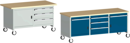 "description": "roulant, HxlxP 840x2000x750mm, plateau hêtre rouge, force 1200kg, 4 pieds, équipement : 5tiroirs, 2armoires, RAL7035, face avant RAL5010,4 roulettes pivotantes",