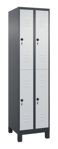 Les principales dimensions de C+P l’armoire vestiaire Classic Plus en un coup d’œil :par compartiment 2 casiers avec chacun 1 tringle et 3 doubles crochets coulissants anti-torsion. porte battante avec porte-étiquette et fentes d’aération. Les gonds intérieurs des portes battantes offrent l’avantage d’un visuel net, car aucune vis ou charnière n’est visible de l’extérieur. Le design de l’armoire n’est donc pas altéré et l’ensemble du meuble semble de meilleure qualité. La surface lisse est également plus facile à nettoyer, car aucun dépôt de saleté ou de poussière n’est à craindre aux endroits inaccessibles. Chaque porte est équipée de série d’un amortisseur, de sorte que, même fermée avec élan, elle ne claque pas. Cela contribue non seulement à améliorer l’environnement sonore, mais protège aussi l’armoire en acier des dommages. La structure BIONIC Steel Frame, inspirée de la nature, est une construction particulièrement efficace et stable. La structure interne raffinée composée de pliages, d’entretoises et d’espaces, ainsi que la plus grande épaisseur de matériau aux endroits cruciaux, comme à l’avant des parois latérales et dans les profilés de cloisons et de caissons, augmentent encore la rigidité. Verrouillable avec Porte-cadenas de sécurité pour cadenas. La serrure de sécurité est particulièrement résistante aux effractions puisqu’elle tourne en position verrouillée et se verrouille uniquement après le retrait de la serrure. Convient pour tous les cadenas avec une épaisseur d'anse de 6 - 8 mm. Les orifices de ventilation supplémentaires dans le compartiment, combinés aux fentes d’aération dans la porte, améliorent le flux d’air. L’intérieur de l’armoire est ainsi mieux ventilé et son contenu sèche plus vite, sans générer de mauvaises odeurs. Les pieds encastrés en plastique confèrent non seulement un aspect moderne et léger à l’armoire, qui paraît moins massive, mais offrent également des avantages pratiques. L’espace ouvert au-dessus du sol facilite le nettoyage et le matériau plastique offre une protection accrue contre la corrosion. Cet aspect est particulièrement important dans les environnements où les exigences en matière d’hygiène sont élevées. structure en acier, soudé de manière stable. Cela rend la structure particulièrement robuste et résistante, et donc plus durable. Les coins et les angles soudés du corps garantissent une plus grande étanchéité et donc une meilleure protection contre la poussière, l’humidité et la saleté qu’une structure vissée. En outre, il n’est pas nécessaire de procéder à des travaux d’entretien réguliers ni à des réajustements. corps avec thermolaquage en RAL7016 gris anthracite, face avant avec thermolaquage en RAL7035 gris clair.