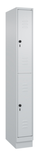 Les principales dimensions de C+P l’armoire vestiaire Classic Plus en un coup d’œil :par compartiment 2 casiers avec chacun 1 tringle et 3 doubles crochets coulissants anti-torsion. porte battante avec porte-étiquette et fentes d’aération. Les gonds intérieurs des portes battantes offrent l’avantage d’un visuel net, car aucune vis ou charnière n’est visible de l’extérieur. Le design de l’armoire n’est donc pas altéré et l’ensemble du meuble semble de meilleure qualité. La surface lisse est également plus facile à nettoyer, car aucun dépôt de saleté ou de poussière n’est à craindre aux endroits inaccessibles. Chaque porte est équipée de série d’un amortisseur, de sorte que, même fermée avec élan, elle ne claque pas. Cela contribue non seulement à améliorer l’environnement sonore, mais protège aussi l’armoire en acier des dommages. La structure BIONIC Steel Frame, inspirée de la nature, est une construction particulièrement efficace et stable. La structure interne raffinée composée de pliages, d’entretoises et d’espaces, ainsi que la plus grande épaisseur de matériau aux endroits cruciaux, comme à l’avant des parois latérales et dans les profilés de cloisons et de caissons, augmentent encore la rigidité. Verrouillable avec Porte-cadenas de sécurité pour cadenas. La serrure de sécurité est particulièrement résistante aux effractions puisqu’elle tourne en position verrouillée et se verrouille uniquement après le retrait de la serrure. Convient pour tous les cadenas avec une épaisseur d'anse de 6 - 8 mm. Les orifices de ventilation supplémentaires dans le compartiment, combinés aux fentes d’aération dans la porte, améliorent le flux d’air. L’intérieur de l’armoire est ainsi mieux ventilé et son contenu sèche plus vite, sans générer de mauvaises odeurs. Le socle encastré permet de répartir uniformément le poids de l’armoire sur le sol. Cela augmente la stabilité et l’armoire peut supporter des charges plus lourdes qu’une armoire à pieds. De plus, la saleté, la poussière et l’humidité ne peuvent pas s’infiltrer sous l’armoire, ce qui réduit la surface de nettoyage. structure en acier, soudé de manière stable. Cela rend la structure particulièrement robuste et résistante, et donc plus durable. Les coins et les angles soudés du corps garantissent une plus grande étanchéité et donc une meilleure protection contre la poussière, l’humidité et la saleté qu’une structure vissée. En outre, il n’est pas nécessaire de procéder à des travaux d’entretien réguliers ni à des réajustements. corps avec thermolaquage en RAL7035 gris clair, face avant avec thermolaquage en RAL7035 gris clair.
