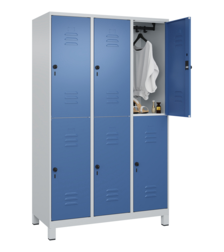 Les principales dimensions de C+P l’armoire vestiaire Classic Plus en un coup d’œil :par compartiment 2 casiers avec chacun 1 tringle et 3 doubles crochets coulissants anti-torsion. porte battante avec porte-étiquette et fentes d’aération. Les gonds intérieurs des portes battantes offrent l’avantage d’un visuel net, car aucune vis ou charnière n’est visible de l’extérieur. Le design de l’armoire n’est donc pas altéré et l’ensemble du meuble semble de meilleure qualité. La surface lisse est également plus facile à nettoyer, car aucun dépôt de saleté ou de poussière n’est à craindre aux endroits inaccessibles. Chaque porte est équipée de série d’un amortisseur, de sorte que, même fermée avec élan, elle ne claque pas. Cela contribue non seulement à améliorer l’environnement sonore, mais protège aussi l’armoire en acier des dommages. La structure BIONIC Steel Frame, inspirée de la nature, est une construction particulièrement efficace et stable. La structure interne raffinée composée de pliages, d’entretoises et d’espaces, ainsi que la plus grande épaisseur de matériau aux endroits cruciaux, comme à l’avant des parois latérales et dans les profilés de cloisons et de caissons, augmentent encore la rigidité. Verrouillable avec Porte-cadenas de sécurité pour cadenas. La serrure de sécurité est particulièrement résistante aux effractions puisqu’elle tourne en position verrouillée et se verrouille uniquement après le retrait de la serrure. Convient pour tous les cadenas avec une épaisseur d'anse de 6 - 8 mm. Les orifices de ventilation supplémentaires dans le compartiment, combinés aux fentes d’aération dans la porte, améliorent le flux d’air. L’intérieur de l’armoire est ainsi mieux ventilé et son contenu sèche plus vite, sans générer de mauvaises odeurs. Les pieds encastrés en plastique confèrent non seulement un aspect moderne et léger à l’armoire, qui paraît moins massive, mais offrent également des avantages pratiques. L’espace ouvert au-dessus du sol facilite le nettoyage et le matériau plastique offre une protection accrue contre la corrosion. Cet aspect est particulièrement important dans les environnements où les exigences en matière d’hygiène sont élevées. structure en acier, soudé de manière stable. Cela rend la structure particulièrement robuste et résistante, et donc plus durable. Les coins et les angles soudés du corps garantissent une plus grande étanchéité et donc une meilleure protection contre la poussière, l’humidité et la saleté qu’une structure vissée. En outre, il n’est pas nécessaire de procéder à des travaux d’entretien réguliers ni à des réajustements. corps avec thermolaquage en RAL7035 gris clair, face avant avec thermolaquage en RAL5023 bleu distant.