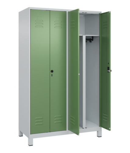 . Les principales dimensions de C+P l’armoire vestiaire Classic Plus en un coup d’œil :par compartiment 1 tringle robuste à profil ovale avec 3 doubles crochets coulissants anti-torsion, au-dessus une tablette à chapeaux continue tous les 2 compartiments. Cette tablette extra large offre un espace de rangement idéal pour les EPI comme les casques, les protections oculaires ou auditives. porte à double battant avec fentes d’aération et porte-étiquette. Les gonds intérieurs des portes battantes offrent l’avantage d’un visuel net, car aucune vis ou charnière n’est visible de l’extérieur. Le design de l’armoire n’est donc pas altéré et l’ensemble du meuble semble de meilleure qualité. La surface lisse est également plus facile à nettoyer, car aucun dépôt de saleté ou de poussière n’est à craindre aux endroits inaccessibles. Chaque porte est équipée de série d’un amortisseur, de sorte que, même fermée avec élan, elle ne claque pas. Cela contribue non seulement à améliorer l’environnement sonore, mais protège aussi l’armoire en acier des dommages. La structure BIONIC Steel Frame, inspirée de la nature, est une construction particulièrement efficace et stable. La structure interne raffinée composée de pliages, d’entretoises et d’espaces, ainsi que la plus grande épaisseur de matériau aux endroits cruciaux, comme à l’avant des parois latérales et dans les profilés de cloisons et de caissons, augmentent encore la rigidité. Verrouillable avec Porte-cadenas de sécurité pour cadenas. La serrure de sécurité est particulièrement résistante aux effractions puisqu’elle tourne en position verrouillée et se verrouille uniquement après le retrait de la serrure. Convient pour tous les cadenas avec une épaisseur d'anse de 6 - 8 mm. Chaque personne dispose de 2 compartiments qui peuvent être verrouillés ensemble via des portes convergentes. Cela permet de séparer de manière simple et efficace les vêtements de travail et ceux de tous les jours. Les orifices de ventilation supplémentaires dans le compartiment, combinés aux fentes d’aération dans la porte, améliorent le flux d’air. L’intérieur de l’armoire est ainsi mieux ventilé et son contenu sèche plus vite, sans générer de mauvaises odeurs. Les pieds encastrés en plastique confèrent non seulement un aspect moderne et léger à l’armoire, qui paraît moins massive, mais offrent également des avantages pratiques. L’espace ouvert au-dessus du sol facilite le nettoyage et le matériau plastique offre une protection accrue contre la corrosion. Cet aspect est particulièrement important dans les environnements où les exigences en matière d’hygiène sont élevées. structure en acier, soudé de manière stable. Cela rend la structure particulièrement robuste et résistante, et donc plus durable. Les coins et les angles soudés du corps garantissent une plus grande étanchéité et donc une meilleure protection contre la poussière, l’humidité et la saleté qu’une structure vissée. En outre, il n’est pas nécessaire de procéder à des travaux d’entretien réguliers ni à des réajustements. corps avec thermolaquage en RAL7035 gris clair, face avant avec thermolaquage en RAL6011 vert réséda.